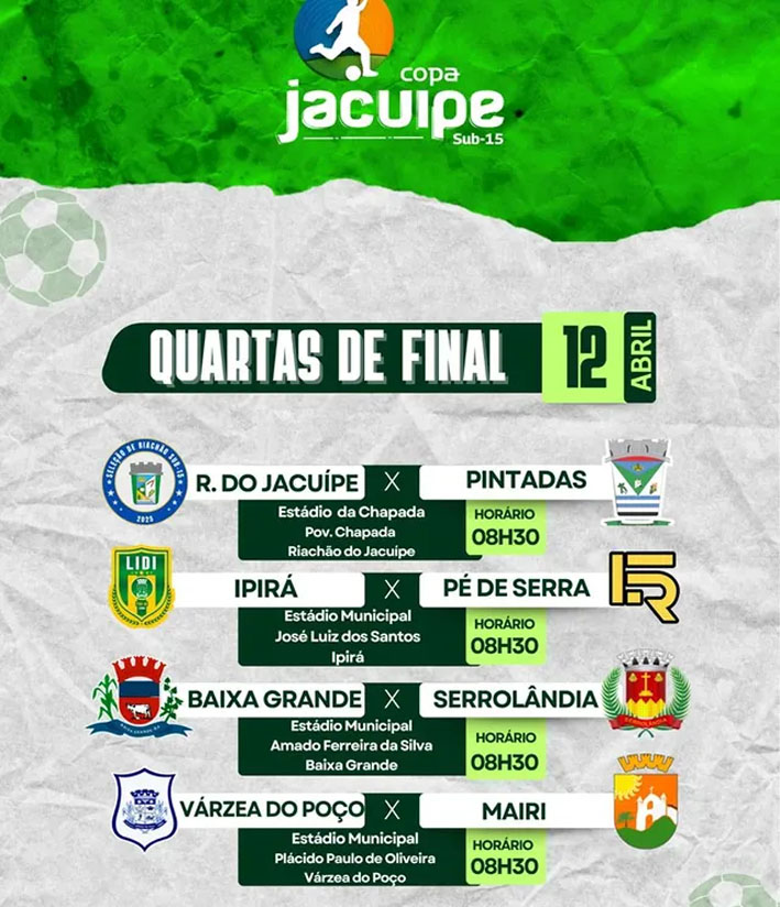 A fase decisiva chegou! Foram divulgados os confrontos das quartas de final da Copa Jacuípe 2026, e agora não há mais espaço para erros: é vencer ou dar adeus à competição.